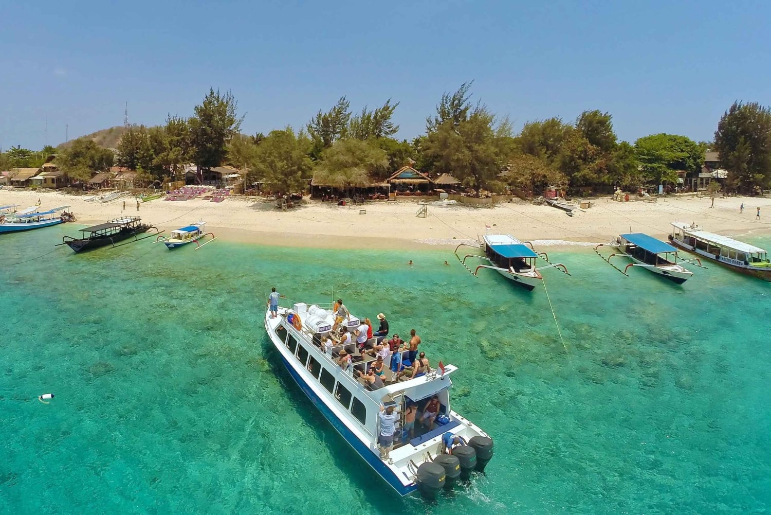 Servicio de barco rápido entre el puerto de Serangan, Bali Sur, y Gili Trawangan, Lombok, vía Nusa Penida, durante 3 horas de viaje