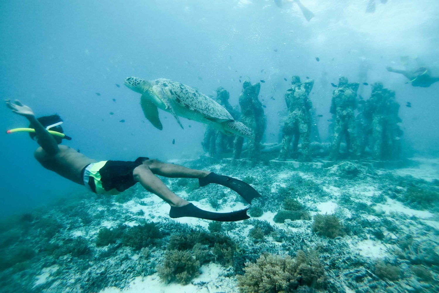 Discover underwater statues, turtles, corals, fish, and more on a snorkeling trip in the crystal-clear waters of the Gili Islands. Set sail on a glass-bottomed boat, visit three snorkeling spots, and choose from a 2-hour, 3-hour or 4-hour tour. Meet the crew at an easy-to-find meeting point and get your snorkeling equipment and choose your fin size with help from your instructors. Board the glass-bottomed boat and set sail from Gili Meno to your first snorkeling spot. Visit three spots where you will swim with sea turtles and dive down to enjoy underwater statues. Be entertained by the colorful corals and fish. Let the crew capturing photos and videos of your experience with the provided GoPro camera. If you've chosen the 3 or 4-hour tour option, there will be a part to visit Gili Air mainland. Finally, sail back to Gili Meno where you will return your equipment and say goodbye to the crew. IMPORTANT NOTES: *Kindly be advised that the Underwater Statue Point is one of the most iconic landmarks in the Gili Islands and may experience high visitor traffic, particularly during peak hours. Maintain the expectation. *When booking, please share an active WhatsApp number for further coordination. Any inconvenience due to its absence will not be our responsibility.Includes