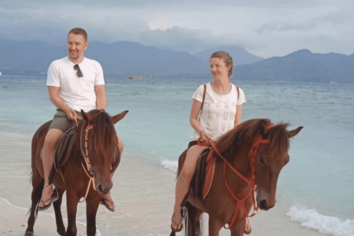 Embark on an unforgettable journey along the sun-kissed shores of Gili Air with a one-hour horse riding adventure. As you mount your horse and set off along the pristine coastline, immerse yourself in the natural beauty that surrounds you. Feel the excitement as your horse's hooves rhythmically meet the soft sand, creating a soothing melody that harmonizes with the gentle lull of the waves. The salty sea breeze caresses your skin, invigorating your senses as you explore this tropical paradise on horseback. Take in the breathtaking panoramic views of the azure waters stretching endlessly before you, framed by swaying palm trees and lush greenery. Spot local fishermen going about their daily routines, their vibrant boats adding splashes of color to the tranquil seascape. Guided by experienced handlers, feel safe and confident as you traverse the island's coastline. Whether you're an experienced equestrian or a first-time rider, knowledgeable guides are there to ensure a memorable and enjoyable experience for all. Capture magical moments against the backdrop of Gili Air's stunning scenery, as you create memories that will last a lifetime. With this one-hour horse riding adventure, let the beauty of the beach and the grace of the horse transport you to a world of pure serenity and bliss.Includes
