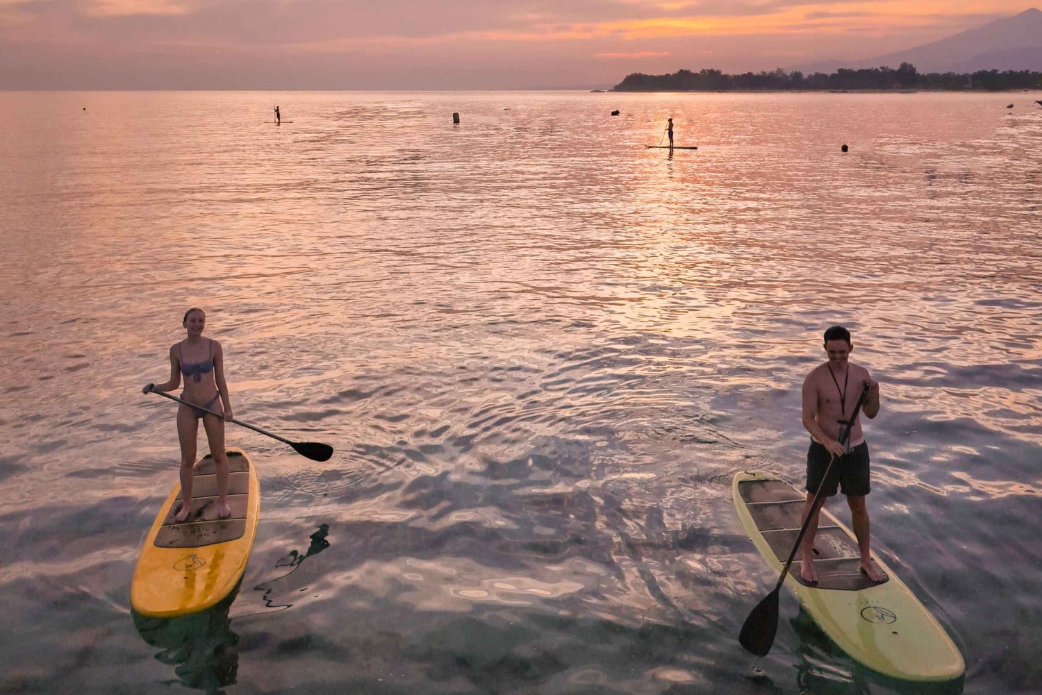 Experience the magic of Gili Trawangan at its most serene — just before the world wakes up. Glide across calm turquoise waters as the first golden light rises behind Mount Rinjani, painting the sky with soft shades of pink, orange, and gold. Whether you're a complete beginner or an experienced paddler, this peaceful adventure offers a perfect blend of calm, beauty, and a touch of thrill. Before starting, receive a free introductory lesson on how to use the paddle board safely and comfortably. One of the friendly instructors will also accompany you on the water for the first 15 minutes, making sure you feel confident and relaxed before continuing on your own. The entire experience lasts up to 120 minutes, giving you plenty of time to explore the coastline, take in the views, and truly enjoy the tranquility of the morning sea. The waters around sunrise are typically calm and glassy — ideal for balance, reflection, and soaking in the breathtaking scenery. To make the moment even more unforgettable, receive a free drone photo shot for the Sunrise session, perfectly capturing your sunrise adventure from above — a beautiful memory to take home from your time in paradise. This is more than just paddle boarding — it’s your front-row seat to one of nature’s most beautiful shows.Includes