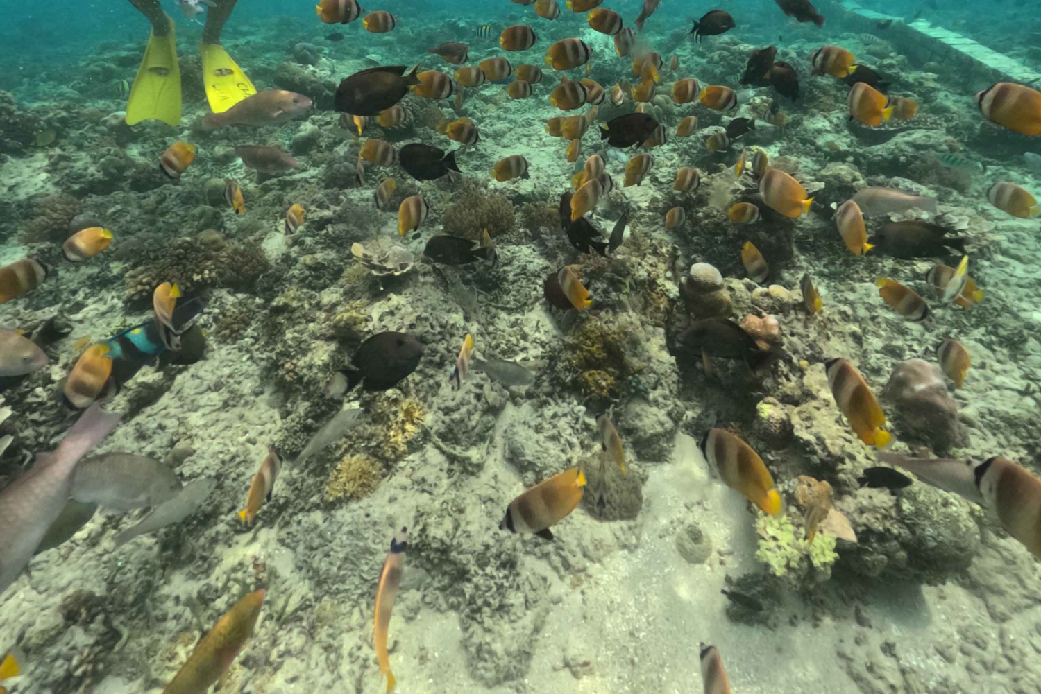 - Подводное плавание с маской и трубкой во время кормления разноцветных рыбок